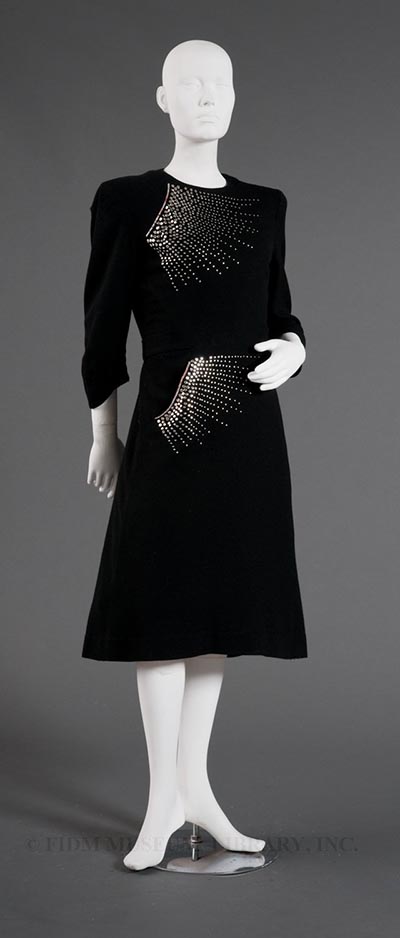 Dresses embellished with decorative gold, brass or silver nail heads first appeared in the late 1930s. Usually seen on solid-colour "background" dresses of wool or synthetic crepe, nail heads were used as glittering accents on the bodice, sleeves, belt, collar, pocket or cuffs. Marketed towards the "smart, lithe, swift moving figures of youth" for evening or special occasion dress, nail head decoration was also used more sparsely on dresses intended for day wear. Typical placement usually focused on the neckline and upper bodice. In 1940 it was introduced onto the skirt.