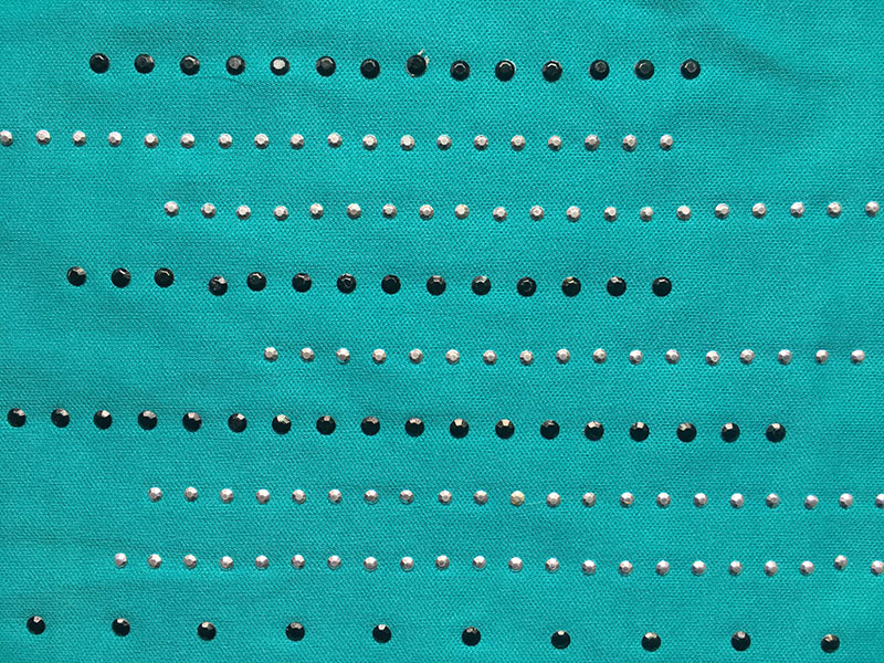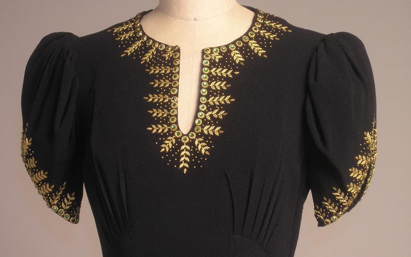 Nail heads also contained gold-coloured leaves and green rhinestones. The rhinestones and leaves are more elaborate than other nail head decoration featured in period advertisements. However, like many other late 1930s nail head dresses, the placement of the nail heads suggests jewelry, especially a necklace. This placement might point to the origins of nail head embellishment. . In the late 1930s it was also introduced into men's wear. Today it remains popular on shoes, belts, sandals, necklines and pockets.