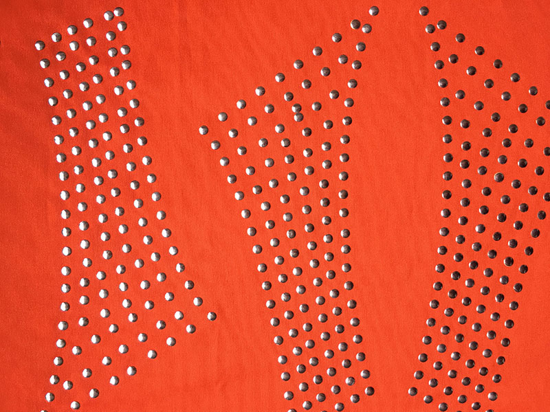 Another point of origin for nail head embellishment might be the work of Schiaparelli. In the late 1930s, Schiaparelli created lavishly embroidered and embellished evening capes, suits and jackets. Featuring metallic embroidery, elaborate gold buttons and glass jewels, these creations were beyond the financial reach of the ordinary people.